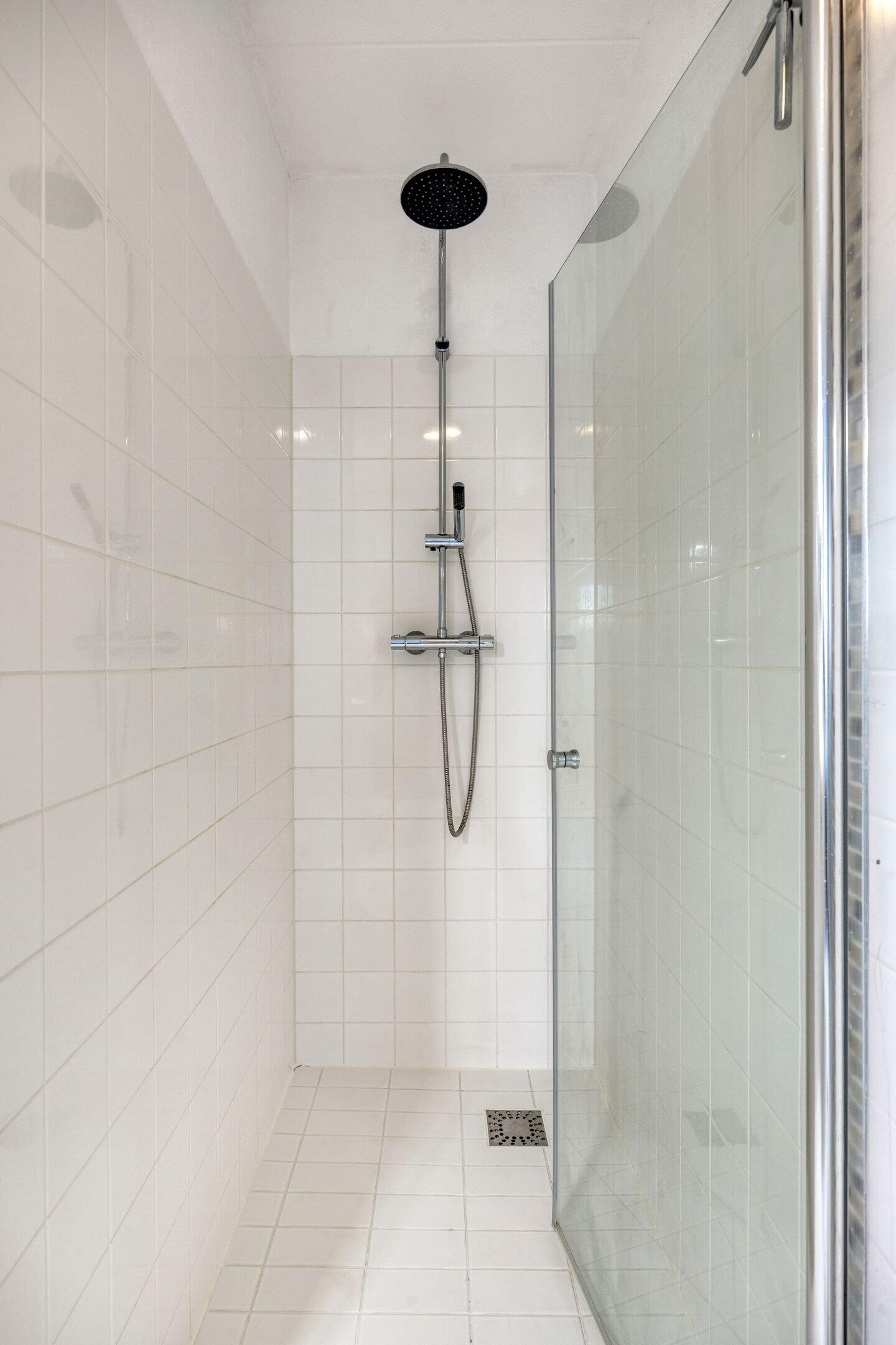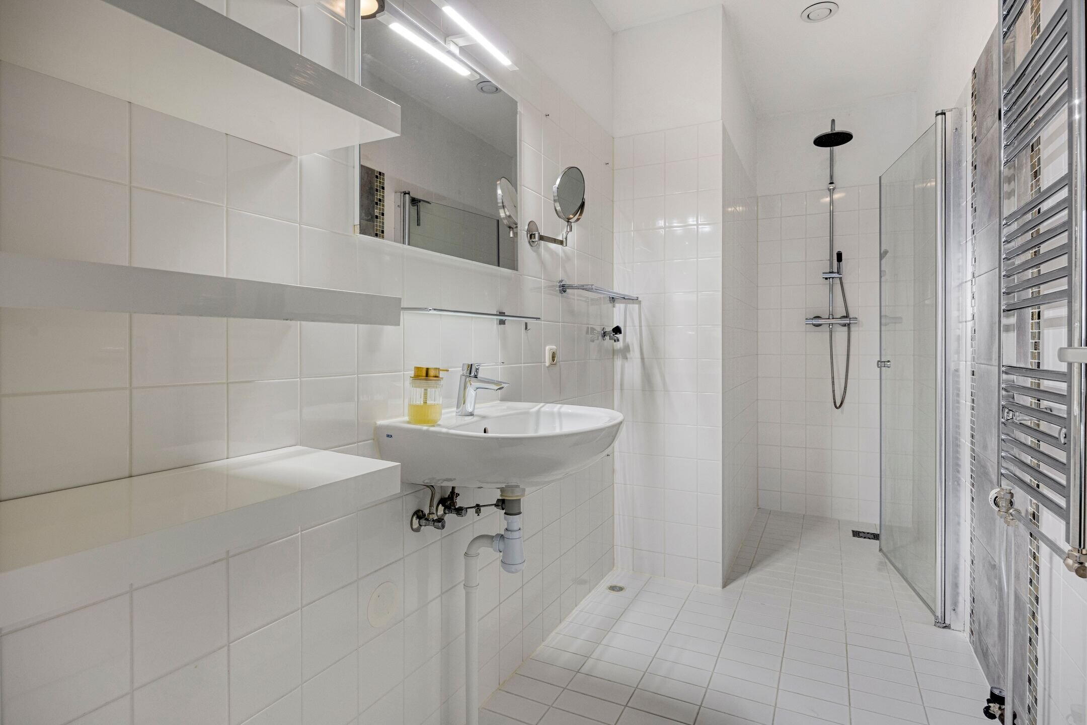 De slaapkamer is rustig gelegen en biedt ruimte voor een tweepersoonsbed en kasten. De badkamer is licht en netjes afgewerkt met een regendouche, wastafel en designradiator. Daarnaast is er een praktische kast met aansluiting voor de wasmachine en technische installaties.