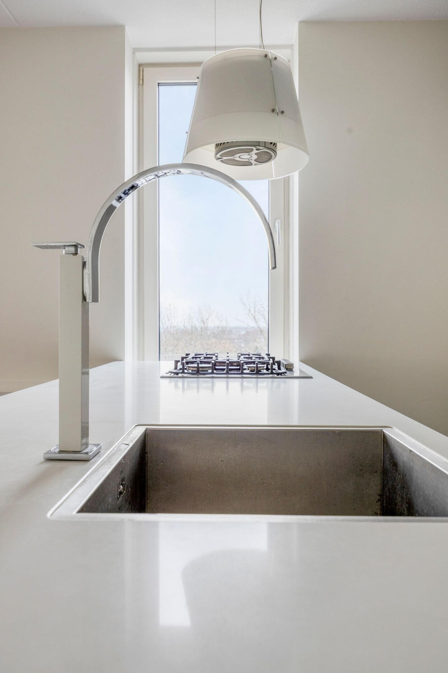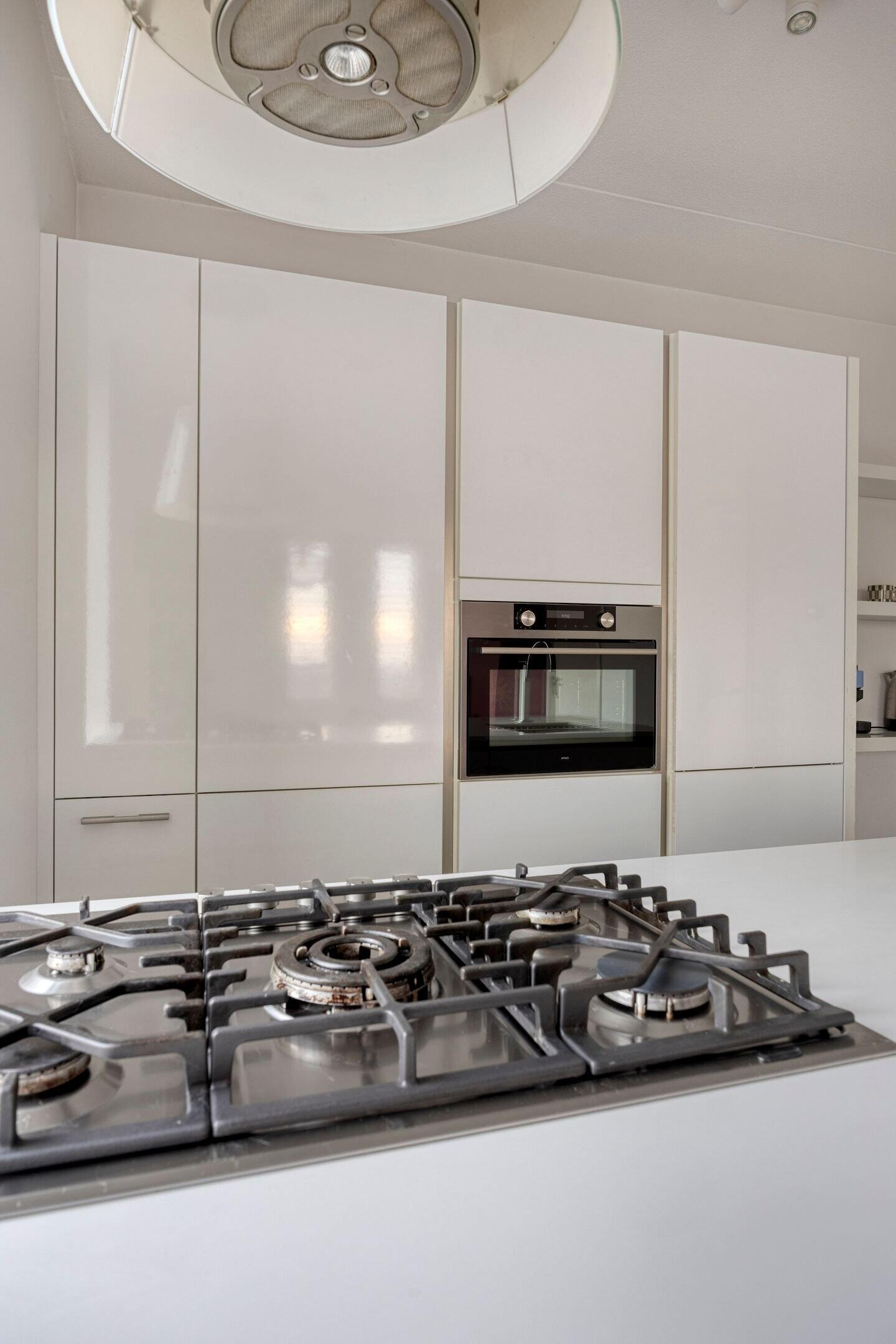 De open keuken is modern uitgevoerd en voorzien van diverse inbouwapparatuur, waaronder een gaskookplaat, afzuigkap, combi-oven, vaatwasser en koel-/vriescombinatie. De opstelling biedt voldoende werk- en bergruimte.